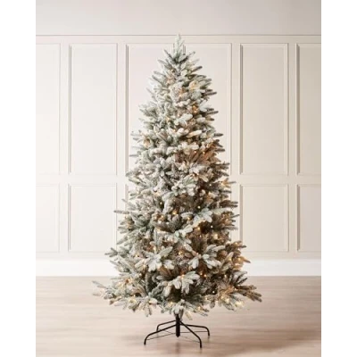 Slim 9 ft artificial tree with snow-flocked PE/PVC branches 3,165 tips for a full and realistic appearance 700 warm white LEDs with eight lighting functions Includes slow glow, chasing and twinkle settings Supplied with 5 m cable and low-voltage transformer