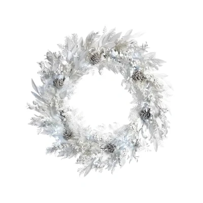 Pre-lit with 50 Ice White LEDs Built in 8 setting memory function control Timer Function: 6 hours on and 18 hours off Requires 3 x AABatteries (Not included) Diameter: 76 cm/30 Inch