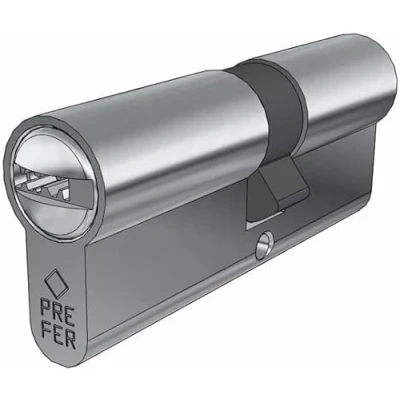 Matt nickel plated finish DIN h5 scoop 3 punched keys supplied M5x75 fixing screw included anti bumping and anti pick device, double mushroom counterpins, carbonitrided steel counterpins, stainless steel encryption pins, Manufacturer: Prefer Srl
