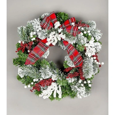 Prelit Battery Operated Christmas Wreath 60cm Decorated with Tartan Ribbons, Berries, Froste Tips Front Door Room Wall Home Hanging Xmas Decorations