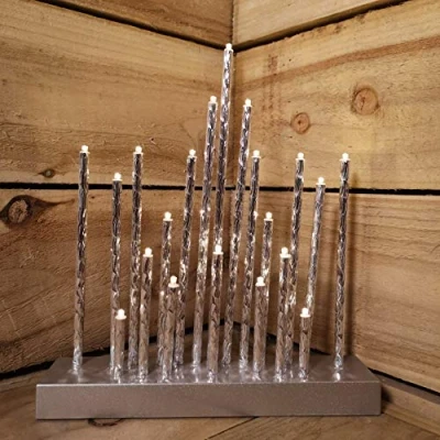 Add a touch of modern elegance to your festive decor with this Silver Christmas Candle Bridge with 20 LEDs. A stylish addition to any indoor Christmas display. Whether placed on a mantelpiece, windowsill, or tabletop, it’s sure to become a standout feature of your seasonal decor.. Featuring with 20 warm white LED candles, each with a delicate twist-effect finish, the graceful arch emits a soft, ambient glow that brings warmth and charm to your home. Measuring 27cm, this beautifully crafted piece features a sleek, contemporary design in silver aluminium. Battery operated for convenient placement anywhere around the home, it requires 3 x AA batteries (not included).. Suitable for indoor use only.. Product Specifications. 20 Warm White LEDs. 27cm in Size. Requires 3 x AA