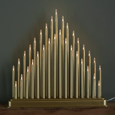 Add a glow to your festive décor with this 34cm Light Up Gold Christmas Candlebridge with LED Lights. Whether placed in a window to create a welcoming glow from outside, placed on a mantelpiece this Christmas Candlebridge brings effortless seasonal elegance to any setting.. Illuminated by 33 LED lights, it casts a soft, warm glow that instantly enhances the atmosphere of your home. With its sleek gold finish, this candlebridge offers a stylish alternative to traditional wooden designs. Measuring 36cm in length and 34cm in height, this candlebridge is perfectly sized for most indoor flat surfaces.. Designed for convenience, it is mains powered and comes complete with a 1.5 metre lead wire from the plug, giving you flexibility when positioning it around your home.. Suitable for indoor use only.. Product Specifications. 33 Warm White LEDs. Height: 34cm Length: 36cm. Mains Powered with 1.5m Power Cable