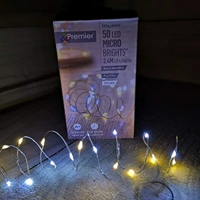 50 LED 2.5m Premier MicroBrights Indoor Outdoor Christmas Multi Function Battery Operated Lights with Timer on Pin Wire in Warm & Cool White. Brighten up your home this Christmas with these battery operated multi function MicroBrights by Premier Decorations. Micro LEDs are spaced approximately 5cm apart and are on a delicate silver pin wire which means that they can be tweaked and manipulated to create dazzling scenes. Each set requires 3x AA batteries (not supplied) for the ECO friendly bulbs to illuminate, change functions by the press of a button on the battery pack. There is a 30cm clear lead from the battery pack to the first bulb, meaning that there is extra space to move it out of sight. Make use of the built in 6 hours on / 18 hours off timer function that will help to preserve battery life, and the memory chip allows the previously used setting to be remembered. Available functions; static, in waves, sequential, slo glo, chasing/flash, slow fade, twinkle/flash and off. Suitable for both indoor and outdoor use, with a water tight seal on the battery pack that will protect against light splashes. Not just for Christmas, this set can be used at any point of the year and in a variety of ways, ideal for providing ambient lighting and creating eye catching scenes. Perfect for events such as Weddings etc and for uses such as floristry and interior design
