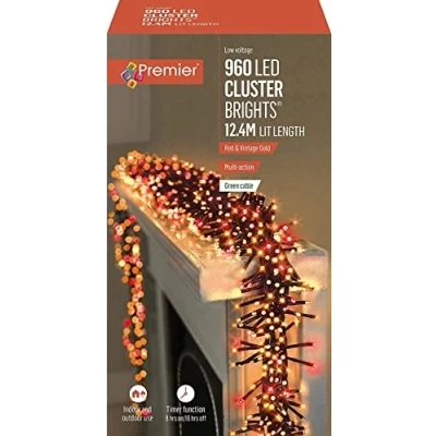 Premier 960 Vintage Gold and Red Multi Action LED Cluster Lights for Christmas Tree, Garland with Timer 6 watts 26.5 x 14.8 11.1 cm; 1.09 Kilograms