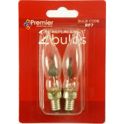 2 Replacement Flickering Bulbs - 230V 1.5W E10 Pack of 2 replacement flickering screw in candle light bulbs. E10 Small Screw All Premier bulbs have been tested for maximum reliability and long life. These bulbs are of the screw-in type. Technical Specification: Power: 1.5W Voltage: 230V Mounting: Screw-in Colour: Clear