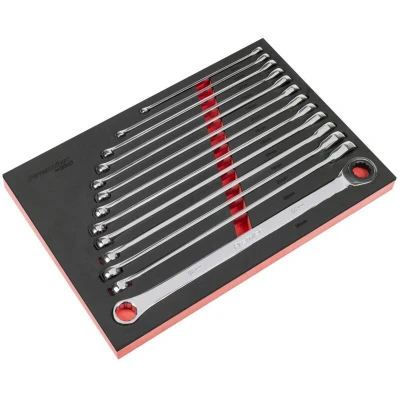 AmazonSEALEY PREMIER - One of a comprehensive range of Premier Hand Tools, suitable for daily professional use. DURABLE - Manufactured from hardened and tempered Chrome Vanadium steel with a fully polished mirror finish SMOOTH RATCHET RING - 72-Tooth ratchet requires only 5° rotation to pick up the next tooth. 13PC SET - Contents: 8, 10, 12, 13, 14, 15, 16, 17, 18, 19, 21, 22, 24mm. EXTRA LONG - Lengths: 230/445mm. SUPPLIED IN EVA FOAM STORAGE TRAY - For easy storage solutions., Manufacturer: Sealey