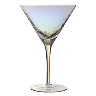 Hammered effect finish that texture their bowls with round indents Iridescent lustre rewards the eye with shades of blue, violet, red and gold Conical bowl and long stem to ensure the hand doesn't warm the drink Care instructions: Wash in warm soapy water, rinse and towel dry Dimensions (H x W x D): 19 x 13 x 13 cm