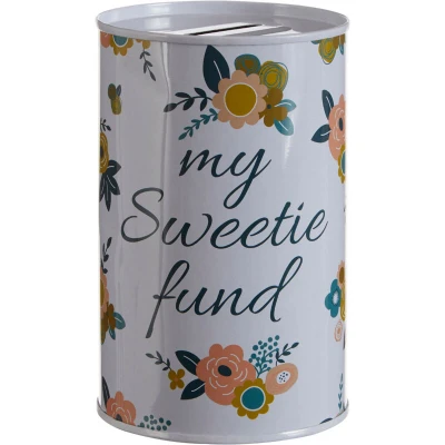 General description This cylindrical money tin is a great way to encourage saving money and stashing away for a rainy day. Money is inserted into the tin through a slit in the lid, and kept securely under the lid. The beautifully styled moneybox features a cute design.