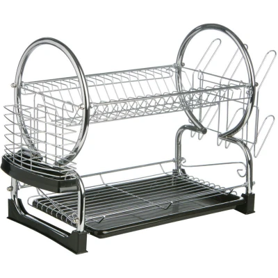 General description Make washing up after meals easier with this chrome metal two-tier dish drainer. Plates can be left to drip dry on the top tier, while utensils and other small items can be placed below. Hang up to six glasses and cups at one end, and drain cutlery at the other. A removable black plastic tray means that excess water can be drained away without fuss.