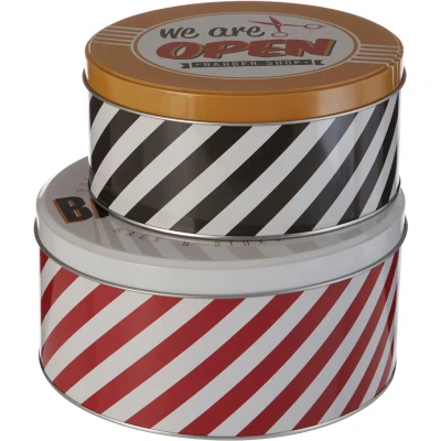 General description Both tins are robust and durable, making them suitable for storing small household objects such as sewing materials or stationery. They feature a vintage look with advertising style lettering that reads "We Are Open" and "The Old Barber Shop". The large tin is decorated with a traditional red and white barber stripe, while the small tin has a contrasting black and white design.