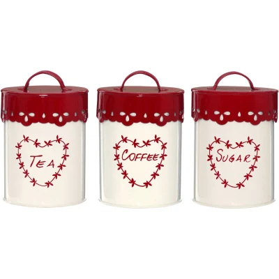 General description This amazing set of canisters by Premier Housewares is a perfect addition to your kitchen. It is designed to help tidy and organize your space while complementing a contemporary design theme. Each canister features clear lettering for easy identification and is adorned with a charming heart print. Technical specifications Height: 14 cm Diameter: 11 cm Material: Metal with a cream-colored coating Lid color: Bright red Compatibility and accessories Includes: 1 x tea canister, 1 x coffee canister, 1 x sugar canister Usage Transfer the contents of tea bags and coffee beans or grinds into these canisters to keep them fresh and organized, enhancing the overall look of your kitchen.
