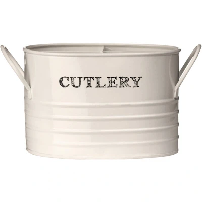 General description The Premier Housewares Sketch Cutlery Caddy features four compartments to keep your forks, knives, and spoons organized and separated. Made from durable metal with a hard-wearing enamel coating, this caddy combines functionality with style. It has looped metal handles on each side for easy carrying and a ribbed detail on the lower half that adds a textured appearance. The gentle cream finish is complemented by bold, grainy black lettering that clearly identifies the utensils.