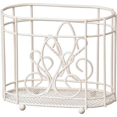 ManoManoGeneral description Scrolled metalwork forms floral patterns on the front and back of this elegant utensil holder. Made from strong metal, it features an oval cage structure with a wire lattice base that allows utensils to be displayed upright. The cream finish enhances its aesthetic appeal, while rounded feet keep it elevated from kitchen surfaces.