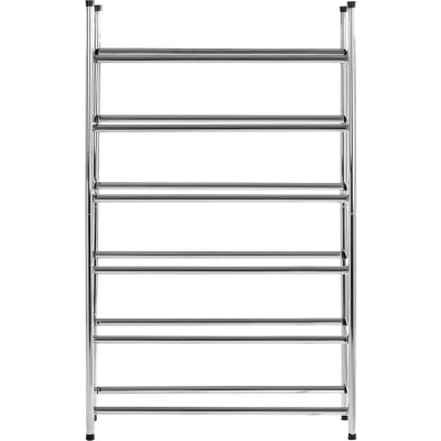 General description In its compact form, the Premier Housewares Six Tiers Chrome Shoe Rack can hold up to eighteen pairs of shoes, and when extended, it can accommodate thirty-six pairs. The rack features a contemporary chrome silver finish and is designed with a slight angle for easy viewing of footwear options. Each leg is equipped with a black glide to protect your flooring. Technical specifications Material: Tubular metal Finish: Chrome silver Capacity (compact): 18 pairs of shoes Capacity (extended): 36 pairs of shoes