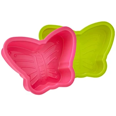Set of two non stick silicone cake moulds Colourful butterfly shapes Dishwasher, microwave, oven and freezer safe Heat resistant up to 230 degrees Celsius H x W x D: 4 x 19 x 14 cm