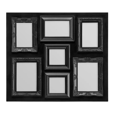 General description A beautiful way to personalise your home, the chic black 7 photo multi-frame is perfect for displaying your favourite captured moments on your wall. Made from durable and lightweight plastic, each frame features elegant embossed detail that enhances its stylish appearance. The set includes 1 landscape frame, 4 portrait frames, and 2 square frames, allowing you to showcase a wider range of pictures. A glass panel protects your chosen images from damage, ensuring you can share treasured moments for years to come.