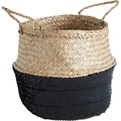 General description This woven basket is created from sustainable seagrass and retains the neutral color of this organic material. The seagrass loop handles at either side of the basket's opening have a matching natural finish. The basket's base is covered by reflective black sequins, contrasting with the light coloring of the upper and adding a decorative flourish.