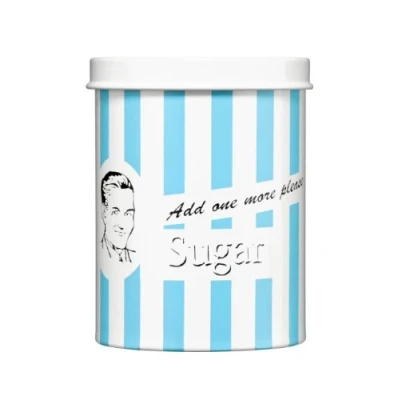 General description Give your kitchen a splash of the past with the stylish Premier Housewares Blue Sugar Canister. Featuring a blue candy stripe design and vintage etchings, this wonderfully designed canister will help organize your kitchen and keep it clutter-free. Made from durable galvanised steel, it has a crisp white finish that beautifully complements the blue accents and the charming "add one more please" detail. The secure lid ensures that the contents stay fresher for longer, while the stylish etching showcases a classic 50's male, enhancing its retro appeal.