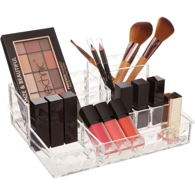 Quality, constructed from premium quality plastic, the cosmetics organiser is sturdy and durable. Design, the organiser is clear with 11 compartments Style, this attractive accent piece will look fantastic on your dresser, holding your makeup brushes, lipsticks and other cosmetics. Multipurpose, other than holding cosmetics, this organiser can also be used to hold bathroom essentials like toothbrushes, cotton rounds or toothpastes. Product dimensions, the dimensions of the cosmetic organiser are w18 x d24 x h9cm