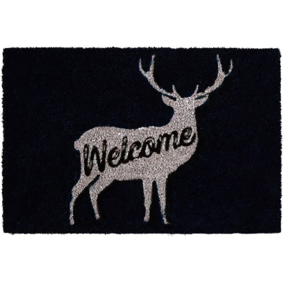 General description Made from eco-friendly coir, this doormat features a dense texture designed to absorb moisture and dirt, effectively protecting your floor. The natural coir surface is colored in black and showcases a grey deer graphic with antlers, adding a decorative touch to your entryway. The anti-slip PVC backing ensures the mat stays securely in place, preventing any movement.