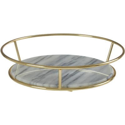 General description Crafted from brass finish metal, this fruit basket features a rounded frame with three sections that neatly join the upper rim to the base. A stylish white marble base sits inside the sleek frame with grey veining creating a subtle tonal contrast.