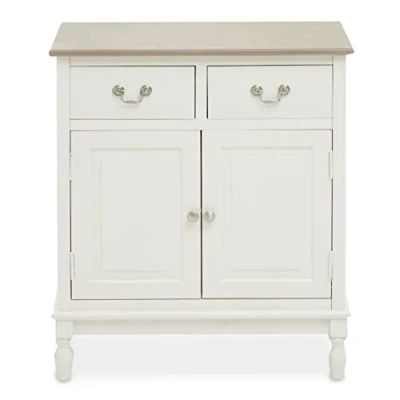 General description Upgrade your living space with our 2 Drawer Sideboard, a perfect blend of vintage charm and practicality. Crafted with care from sustainable pine wood and MDF, this rectangular sideboard features a winter melody table top and an ivory base, exuding timeless elegance. Ideal for hallways, living rooms, or dining rooms, the Heritage sideboard offers a weight-holding capacity of 60kg, ensuring durability without compromising style. Enhance your space with this vintage-inspired sideboard, offering not just style but also functionality. Technical specifications Material: Sustainable pine wood and MDF Weight-holding capacity: 60kg Installation Assembly is straightforward with classic chrome drawer handles and cupboard knobs. Usage 2 spacious drawers and a double door cupboard provide ample storage for your belongings. The cream-colored finish complements any decor. Easy-to-clean surface ensures a lasting pristine look. Other information Note that the natural wood