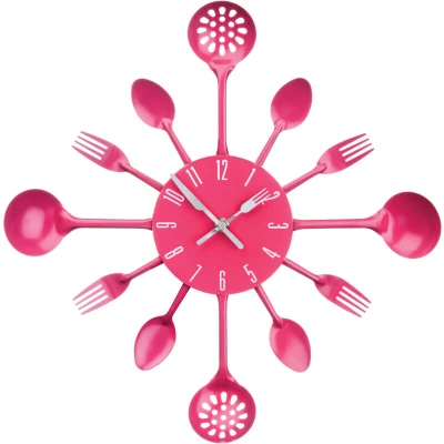 General description Unique and fun, the Premier Housewares Hot Pink Cutlery Metal Wall Clock makes a funky feature in your kitchen. Made from metal with a striking hot pink finish, this clock is designed to stand the test of time while adding a touch of color and enjoyment to your home. Each number correlates to a utensil, including a spoon, ladle, and straining spoon, while the clock hands are designed as a fork and cutter, enhancing its decorative appeal. Technical specifications Height: 33 cm Width: 33 cm Depth: 5 cm Usage The clock is perfect for various settings, including your dining room or kitchen, making mealtimes fun for kids. It is also suitable for a restaurant kitchen. Other information Cleaning the wall clock is easy; simply wipe clean with a soft cloth and avoid using abrasive cleaners.