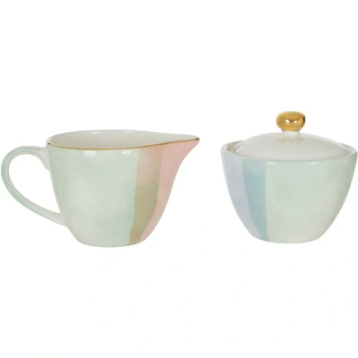 General description The Interiors By Premier Sugar Pot and Creamer Set combines modern design with practical functionality to elevate your dining and beverage-serving experience. Crafted from durable ceramic and finished in hand-painted pastel tones, this set offers a unique and contemporary look. The sugar pot features a matching lid for easy storage, while the creamer is accentuated with a delicate gold-plated rim. This compact yet versatile set is designed to suit a variety of uses, whether you're hosting guests or enjoying a quiet cup of coffee. Technical specifications Dimensions: H7 x D14 x W9 cm Weight: 0.52 kg Usage Use as a coffee creamer companion Utilize as a tea sugar pot Incorporate into a larger dinner service Other information The hand-painted design ensures that each piece is unique Gold-plated detailing enhances visual appeal Care: Wash with warm water before use to preserve the hand-painted finish and gold detailing