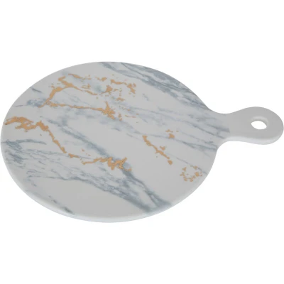 General description Elevate your entertaining experience with the Interiors By Premier Cheese Paddle, a luxurious addition to your kitchenware that seamlessly combines elegance with functionality. This sophisticated cheese paddle is crafted from high-quality white porcelain, offering a sturdy and durable surface perfect for showcasing an array of cheeses, charcuterie, or other delectable treats. The paddle boasts a subtle yet striking marble effect, adding a touch of modern sophistication to your serving style. The warm metallic detail along the edge complements the marble-like veining in muted tones, creating a contemporary aesthetic that enhances any table setting. The matte finish not only adds to its visual appeal but also provides non-stick properties, ensuring that your cheeses and other delicacies remain in place without sticking to the surface. Whether you're serving up a classic charcuterie board or using it as a pizza board, this cheese paddle promises to make every occasion