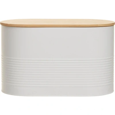 JoybuyThe Alton White Bread Bin is a durable, modern storage solution made from sturdy metal with a smooth white finish and a natural bamboo lid for freshness and style. Its elegant design and practical features make it a chic addition to any contemporary kitchen.
