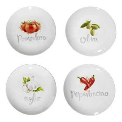 General description Part of the Italia dinnerware range, these antipasti plates are designed to coordinate beautifully with the Italia pasta bowl. Formed from glazed white porcelain, each plate features unique and colorful designs of tomato, garlic, olive, and pepper. Their slightly curved design helps to keep the antipasti in place, making them perfect for serving a selection of meats, cheeses, olives, and breads.
