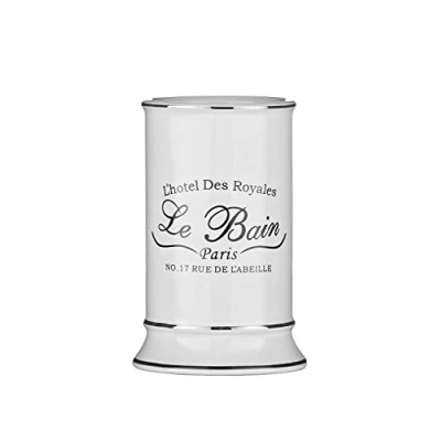 The elegant Le Bain tumbler will not only provide excellent storage for your essentials but enhance the look of your bathroom Made using beautiful, yet durable white stoneware The classical white and French worded detail will complement most decors adding a touch of style and flair to your bathroom Care instructions: Clean with soft damp cloth . Do not use abrasive cleaners Height 13 cm x Width 8 cm x Depth 8 cm
