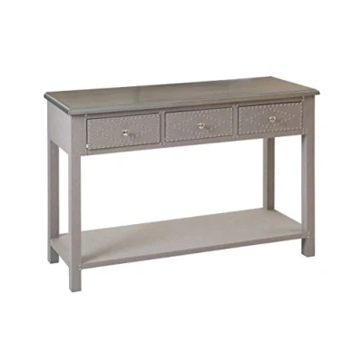 The Manhattan console table will provide style and suitability Made from durable fir wood and covered with stone linen Features three equal sized MDF drawers Care instructions: Wipe clean with a soft cloth or brush softly. Do not use abrasive cleaners Dimensions (H x W x D): 81 x 117 x 38 cm
