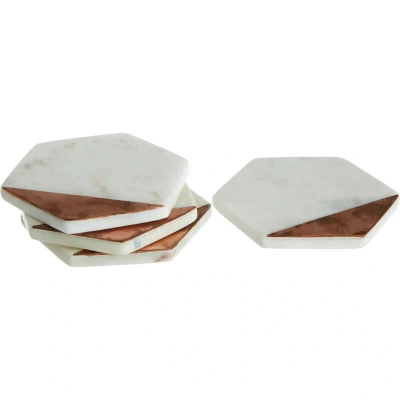 General description These coasters feature a stunning design with a white marble base complemented by a copper inlay detailing on one side. The combination of materials creates a luxurious appeal, enhancing the natural beauty of the marble while adding a touch of elegance to your tabletop decor. Their hexagonal shape and glowing hues contribute to a coordinated and stylish effect.