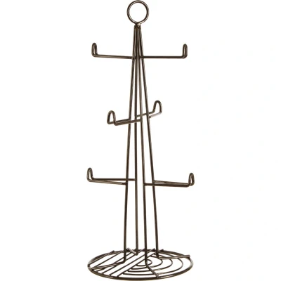 General description The Vertex mug tree is crafted from durable, rust-resistant iron and features a stylish black nickel finish, enhancing its modern aesthetic. Its unique design includes a round base with a combination of curved and straight lines, supporting four ascending iron lines that culminate in a pointed top. This structure is designed to hold up to six mugs, showcasing them elegantly. Technical specifications Material: Rust-resistant iron Finish: Black nickel Capacity: Holds up to 6 mugs