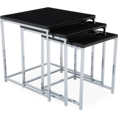 General description Add a touch of sophistication to your living space with the Interiors by Premier Set of Three Black Nesting Side Tables. These chic side tables boast a sleek and smooth black surface complemented by a chrome finish frame, perfect for a contemporary and elegant look. Whether you're hosting friends and family or simply looking to enhance your home decor, these tables provide a stylish and practical solution. Crafted with high-quality materials, these tables offer both durability and stability, ensuring they will remain a staple in your home for years to come. Versatility is key with this set; use the tables to serve snacks and drinks during gatherings, or display your favorite decorative items to add a personal touch to your living area. The smooth synthetic tabletop surface is visually appealing and easy to clean, ensuring that your tables always look their best. Upgrade your living space with the Interiors by Premier Set of Three Black Nesting Side Tables,