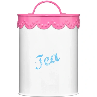General description A decorative white and pink lace tea canister is a great storage solution for your tea bags while keeping the kitchen organized and tidy. A pink lid sits securely on top, creating an airtight canister to keep your tea bags fresh, while the handle ensures easy access when required. Made from galvanised iron with a powder-coated white finish, the canister is suitable for the daily rigors of a busy kitchen. The word "Tea" is written clearly in pastel blues, accentuated against the crisp white, ensuring easy identification of the canister. Complete the set with the matching coffee, sugar, bread, utensil, biscuit canisters, and cake tin.