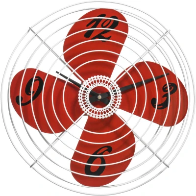General description Add a retro feel to your room with our quirky and practical fan wall clock that ensures time doesn't pass you by. Made from durable metal, this clock is designed to stand the test of time while featuring black numbers accentuated on the red blades for clear and easy readability, complemented by black hands. The authentic look is enhanced by a white wire mesh that protects the clock, making it an aesthetically pleasing feature for your bedroom, kitchen, or living space wall.