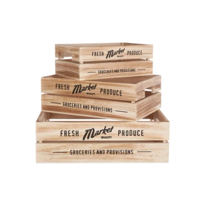 General description This set of three Rustic Provisions Natural Crates is crafted from sustainable paulownia wood, featuring charming grocery store lettering on their sides. The slatted design and cut-out handles at each end enhance their functionality, while the high sides allow for easy stacking of fruits or vegetables.