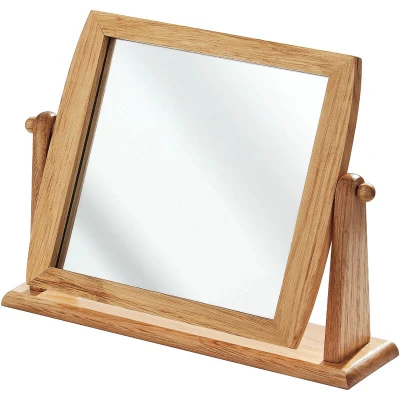 General description Made from natural pine wood, the frame of this mirror is lightly toned and displays exquisite graining. The gently curved frame is supported by a sturdy stand that allows the angle of the mirrored surface to be adjusted, making it ideal for applying makeup. The rectangular base, also made from pine wood, ensures that the mirror remains stable.