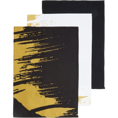 General description Part of the modern retro collection, this set of 3 rectangular tea towels combines style and functionality. Made from soft and durable cotton, these towels are designed to enhance your kitchen decor while providing practical use. Technical specifications Material: Cotton Set includes: 3 tea towels Colors: Black, warm gold, and crisp white