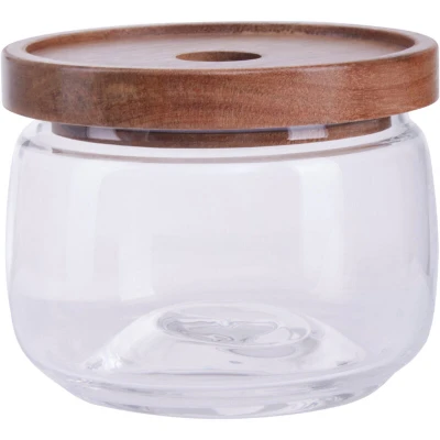 General description This rounded clear glass storage jar is ideal for storing and preserving a variety of ingredients including nuts, grains, tea, and more. The eco-friendly acacia wood lid with rubber lining keeps contents fresh and moisture-free. Technical specifications Capacity: 560ml
