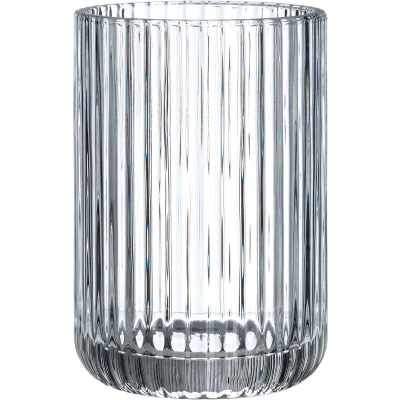 ManoManoGeneral description Thick transparent glass forms the Ticino Brittany tumbler, featuring a ridged fade that adds texture and distinction. This contemporary glass is perfect for drinking water, juice, whiskey, and other beverages. Technical specifications Dimensions: 8 x 11 x 8 cm Compatibility and accessories Display with the Ticino Brittany glass storage jar Compatible with the Ticino Brittany soap dish Works well with the Ticino Brittany lotion dispenser