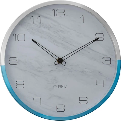 General description A striking piece of attraction, the stylish wall clock by Premier Housewares is a unique item that will be a fantastic addition to your modern home. This round wall clock features an aluminum case in a reflective silver finish, complemented by a blue and metallic silver face that displays a subtle veining effect. It is completed with sleek white hands and two numerals, coordinating with its simple, understated dial. Their minimalism enhances the elegance of this piece, making it suitable for display in various settings such as the kitchen or hallway. Technical specifications Dimensions: 30 x 30 x 4 cm Material: High-quality metal Color: Blue and silver Usage This stylish and practical clock is ideal for your bedroom, dining room, kitchen, office, or living space. Its durable design ensures it will stand the test of time, making it a perfect gift for loved ones on any occasion, especially housewarming parties.