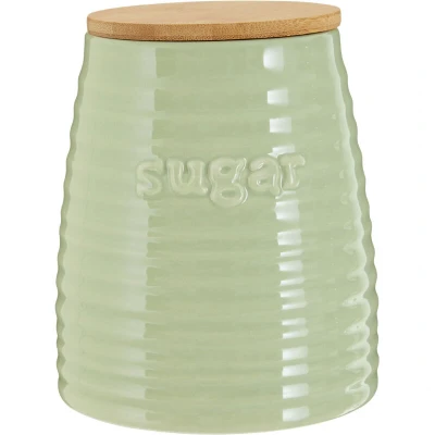 General description Keep your kitchen organised and tidy with this elegant Premier Housewares Winnie Green Dolomite Sugar Canister. The charming sugar canister features a bamboo lid and is ideal for having your cooking essentials close at hand. Its sophisticated tapered design is made from durable dolomite and showcases embossed ribbed detail with the word 'sugar' for easy identification. The deep green finish adds a touch of color to your kitchen, making it a stylish and practical accessory that complements most decors. Technical specifications Material: Dolomite Lid: Bamboo Color: Deep Green Usage This circular and elegantly designed canister can be used to store various items, including: Tea Coffee Cookies Biscuits Powdered products Dog/cat biscuit treats Candy