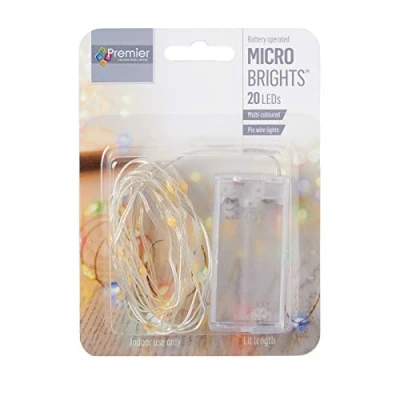 This listing is for a Pack of Ultra Bright LED Lights 20 LED Pin Wire Lights Multi Colour Battery Operated - Requires 2 x AA Batteries (NOT Included) Approximately 0.3m of lead wire between the battery pack and the start of the lights Approximately 1.9m of lights For Indoor Use only