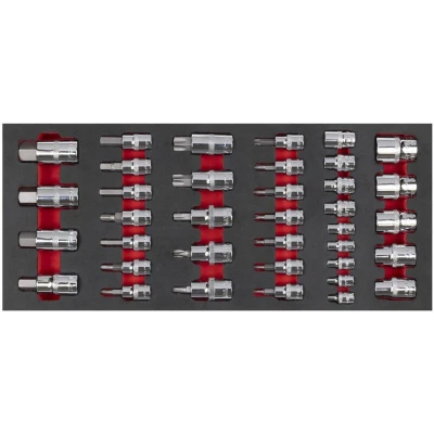 General description Tool Tray with Socket Bit Set, designed to fit the Sealey AP24 series and selected Superline PRO® Topchests, Rollcabs & Workstations. This comprehensive 37-piece socket bit set includes various sizes and types for versatile use. Technical specifications 37 pieces in total 1/4" Sq Drive Socket Bits TRX-Star* Female: E4, E5, E6, E7, E8 3/8" Sq Drive Socket Bits Hex: 4, 5, 6, 7, 8, 9, 10mm TRX-Star*: T10, T15, T20, T25, T27, T30, T40 TRX-Star* Female: E10, E11, E12, E14 1/2" Sq Drive Socket Bits Hex: 12, 14, 17, 19mm TRX-Star*: T45, T50, T55, T60, T70 TRX-Star* Female: E16, E18, E20, E22, E24 Tray Size: 395 x 175 x 35mm Organisation Supplied in an EVA foam tray for easy storage and quick tool selection. Other information LIFETIME GUARANTEE*.