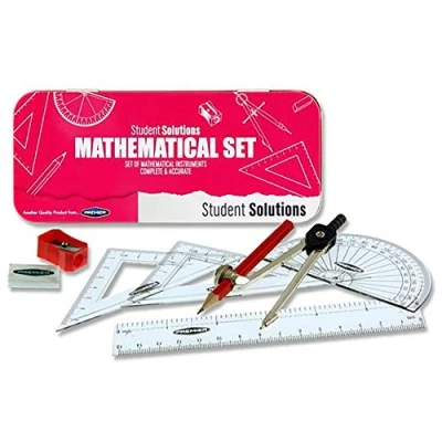 9 Piece Math's Set includes: Ruler, Pencil, Pencil Sharpener, 45° Set Square, 60° Set Square, Pencil Eraser, Compass, 180° Protractor, Timetable & Measurement Chart. Set of Mathematical Instruments in handy storage tin. Colour - Pink. This is a Premier Stationery branded product.