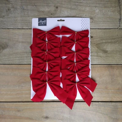General description Pack of 12 red velvet bows, each adorned with a gold tie. Perfect for adding a festive touch to your Christmas tree or for decorating presents. Each bow measures 12cm from the top left to the bottom right.