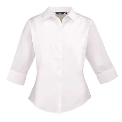 Ladies 3/4 length sleeve poplin blouse; compliments mens style pr202 - made from oeko-tex Standard 100 fabric; fitted styling with bust darts and back darts; 3/4 length sleeves with vented cuff; pearlised buttons on light blue and White Self colour buttons on remaining colours; rounded bottom hem; soft collar styling; easy care fabric; *black and White Available in size 6